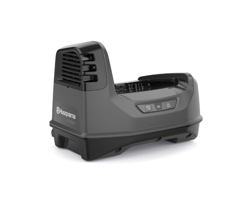 The C900X PACE Battery Charger is compatible with HUSQVARNA B380X and B750X PACE batteries, providing 900 W of power at 240 V with fast charging mode for quick recharging. Its compact design allows easy placement, and users can connect batteries efficiently for seamless workflow and reliable power supply.