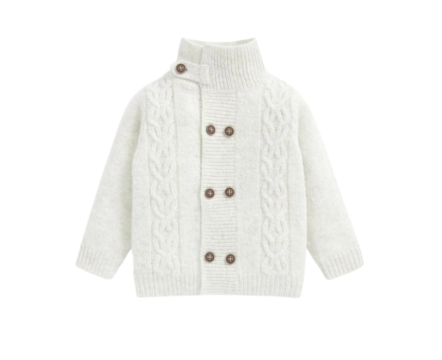 This cable knit cardigan is a timeless layering piece, crafted from soft knitted fabric for warmth and everyday comfort. Designed with long sleeves and a classic cable knit texture, it features a front button fastening for easy dressing. Ideal worn over bodysuits, dresses, or tops, it adds a cosy and polished finish to any baby or toddler outfit.