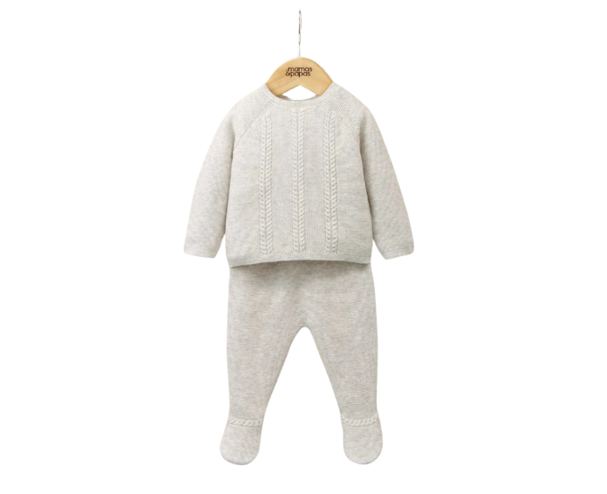 The Cable Knit Top & Bottoms Set in grey is a cosy and stylish 2-piece outfit for baby boys, perfect for cooler days and everyday wear. Featuring a long-sleeved cable knit top with back button fastening and ribbed hems and cuffs, paired with matching bottoms with a stretchy ribbed waistband for comfort and ease of movement. Crafted from 100% cotton, it keeps little boys warm and snug throughout the day.