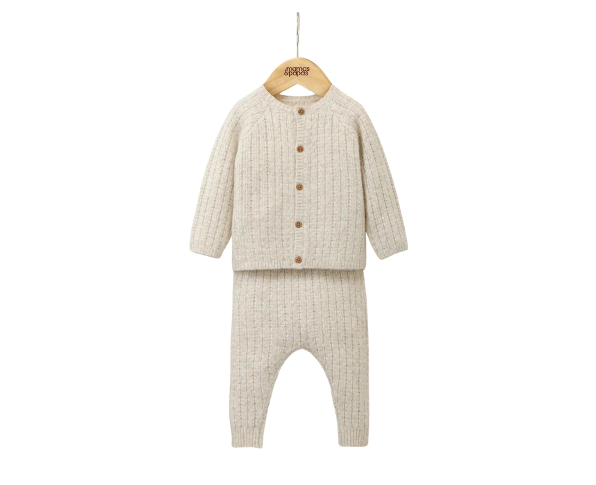This 2-piece cable knit top and bottoms set in a neutral tone keeps little ones cosy on cooler days. The long-sleeved raglan top features ribbed cuffs, neck, and hem with a front button opening, while the matching knit bottoms have a ribbed waistband and cuffs for a snug fit. Perfect for layering or wearing together, this set combines comfort, warmth, and timeless style.