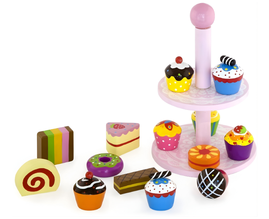 This VIGA Wooden Cake Rack Playset is suitable for children aged 18 months and above. The set features a colourful cake rack with a variety of wooden cakes, perfect for pretend play as a baker or pastry chef. Children can use it to play shops, host dolls tea parties, and develop creativity, imagination, and social skills through fun role play.
