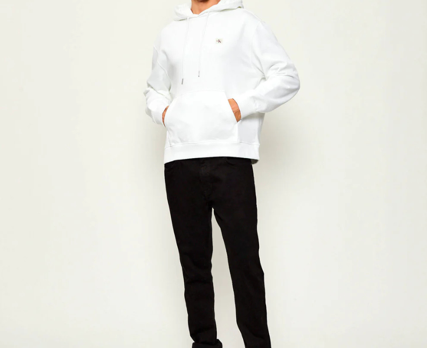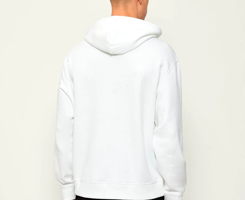 This Calvin Klein Essential White Hoodie offers a clean minimalist look with everyday comfort. Made from a soft blend of 90% cotton and 10% polyester, it features an adjustable drawstring hood, subtle Calvin Klein logo detail, and ribbed cuffs and hem for a secure relaxed fit. Perfect for casual streetwear or lounging, it pairs easily with jeans and sneakers for an effortless everyday style; the model is 180 cm and wears size M.