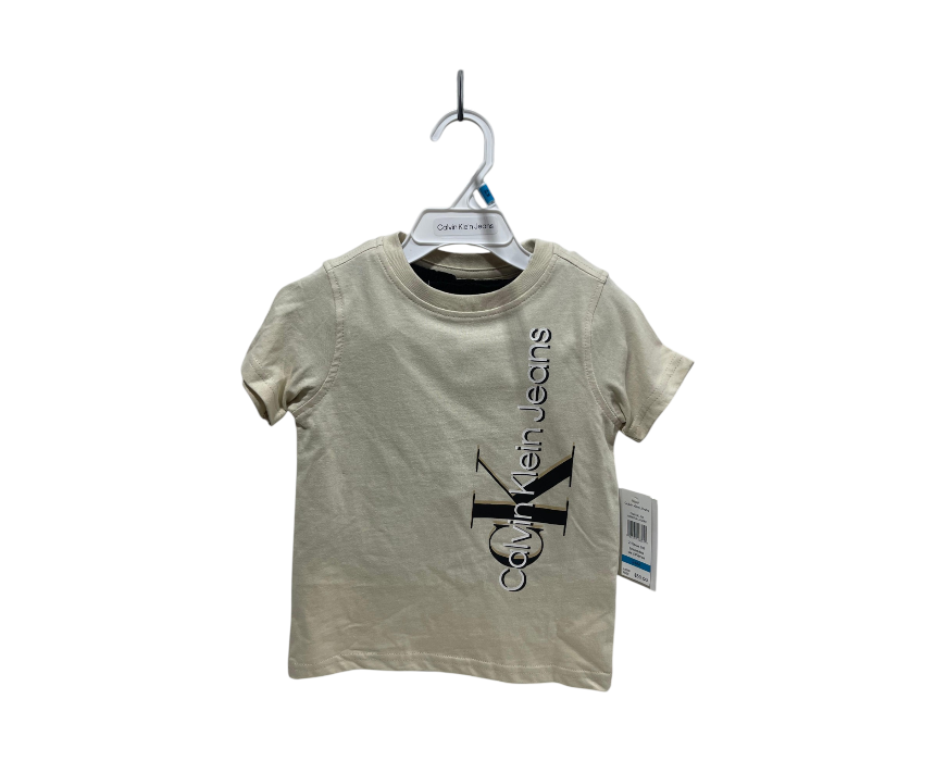 This 24-month Calvin Klein Jeans set features a soft t-shirt with a vertical logo design and a large CK monogram overlay. Crafted from a high-quality blend of 93% cotton and 7% elastane, it provides comfort and stretch for active play. The set comes in a versatile ivory or beige tone, making it perfect for seasonal casual wear. Simply pair with the coordinated bottoms included for a complete designer look. Please check the size (24M) prior to ordering to ensure a proper fit as this includes the two-piece set only.