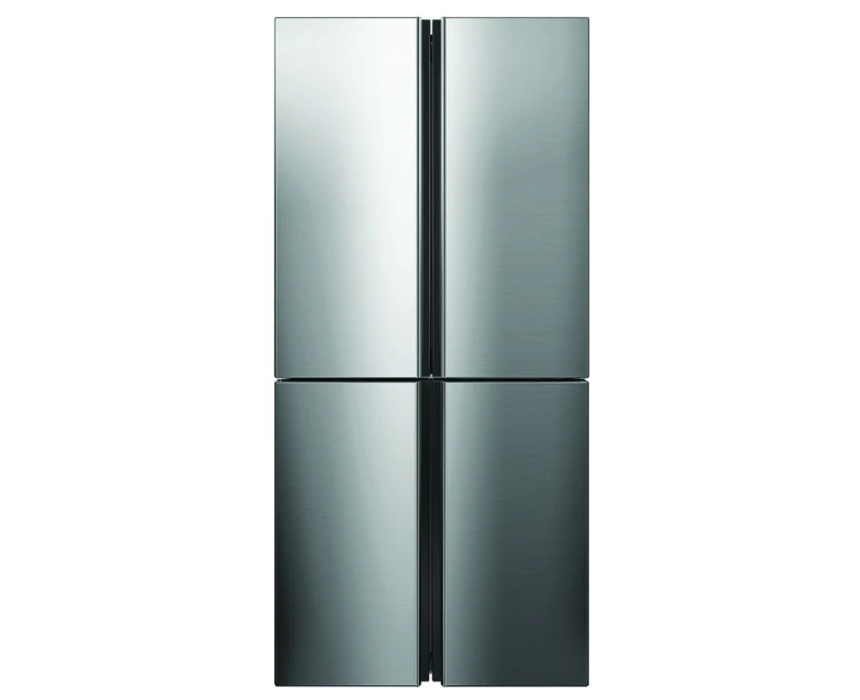 This Quatro 4-Door refrigerator comes in a sleek stainless steel finish with an inverter compressor for efficient cooling. It features 3 glass shelves, 2 crisper drawers, 6 freezer compartments, LED lighting, and an external digital touch control panel with fridge door open alarm. Equipped with energy-saving, fast cooling, and fast freeze modes, it provides reliable performance while maintaining a modern kitchen aesthetic.