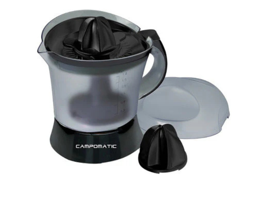The Campomatic VitaSqueeze Citrus Juicer in Black features a 1.2L capacity and 25W power with an auto-reverse function for efficient juice extraction from oranges, lemons, and other citrus fruits. Its compact design makes it easy to use and clean, perfect for daily fresh juice at home. Sleek and modern, it fits seamlessly on countertops while adding a functional and stylish touch to any kitchen.