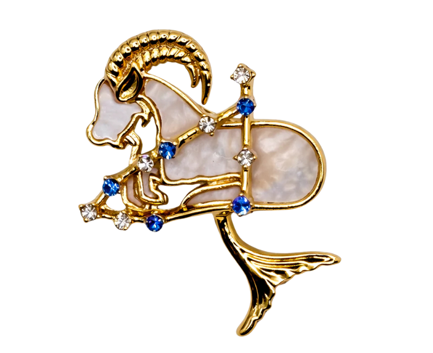 Capricorn Zodiac Brooch Gold Sea Goat Horoscope Pin With Mother Of Pearl