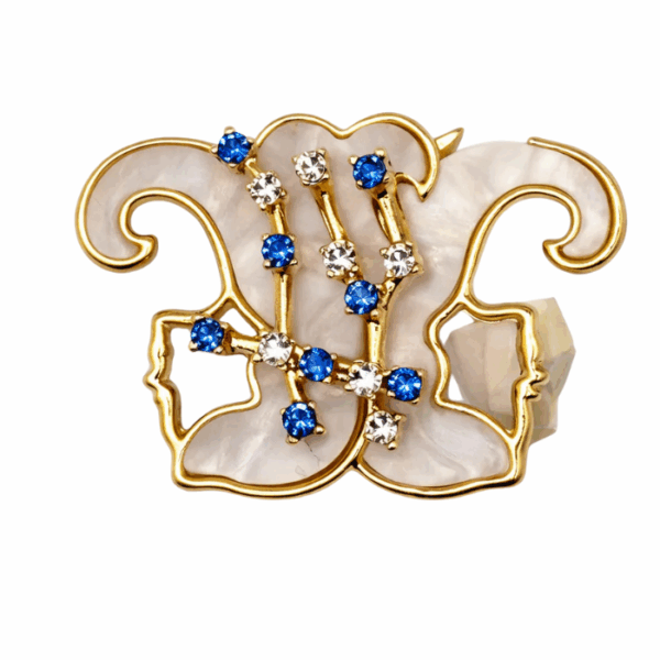 This zodiac brooch features a gold sea goat design accented with lustrous mother of pearl, creating a sophisticated horoscope inspired accessory. Its lightweight construction allows it to be styled on jackets, dresses, scarves, or handbags, adding a personal and elegant touch. Perfect for astrology enthusiasts and for enhancing both everyday and special occasion outfits.