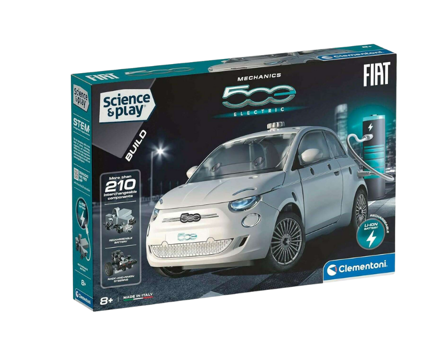 This Electric FIAT 500 Construction Kit lets children aged 8+ build a realistic model powered by a rechargeable lithium battery. The kit includes all components for assembling the car, including rack-and-pinion steering and differential transmission, while the Science Game Build app offers interactive 3D guidance for an engaging assembly experience. Perfect for learning about electric cars, mechanics, and the future of mobility through hands-on play.