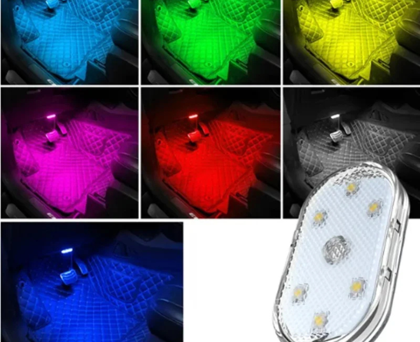 This USB rechargeable interior ambient light features 6 bright LED beads with 8 color options and 2 flashing modes, perfect for cars, closets, or tents. Easy to install with a magnetic base, it attaches securely and charges quickly via USB, lasting up to 1.5 hours per charge. It serves as both a practical lighting solution and an ambient mood enhancer, ideal for travel, home, or vehicle use.