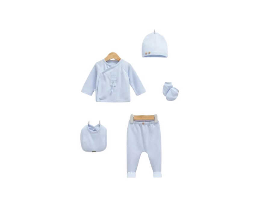 Caramell newborn hospital outfit set includes 5 essential pieces made from 100% natural cotton, gentle on your baby’s delicate skin. Free from nickel and azo, the breathable, premium-quality fabric ensures all-day comfort and safety. Perfect for your baby’s first days, this coordinated set is easy to mix and match for hospital wear or daily use. Available in soft blue, beige, and gray for a calm, stylish look.