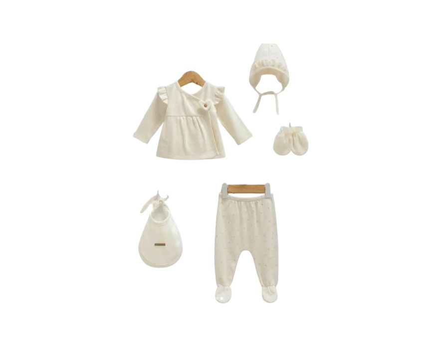 Caramell Cotton 5-piece newborn hospital outfit set is made from 100% natural cotton, gentle on delicate skin and free from nickel and azo for safe, breathable comfort. This premium-quality set includes essential newborn pieces perfect for your baby’s first days, offering softness and ease of dressing. Ideal for hospital wear or gifting, it ensures your newborn stays cozy, stylish, and safe.