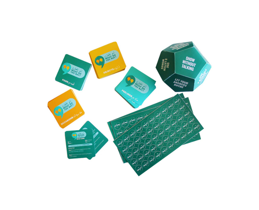 Chou Bet2oul is a fast-paced Lebanese party card game where players draw cards from categories like food, objects, occasions, and feelings, then answer questions against the clock. Use dice and challenges to avoid collecting stickers, and the player with the fewest stickers wins. Designed for competitive fun with friends or family, it’s perfect for game nights. This is suitable for ages 14+.
