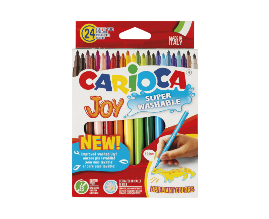 The Carioca Joy Super Washable Fine Tip Pens Set of 24 features 2.8 mm fine blocked tips with vibrant, super-washable ink for precise and creative coloring. Packed in a sturdy box with ventilated caps, these pens are safe and convenient for home, school, or travel use. Made in Italy, they provide high-quality, long-lasting fun for children aged 3 and above under supervision.