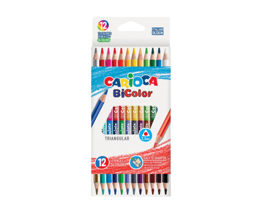 The Carioca Triangular Bicolor Pencils Set of 12 includes high-quality, two-colored wooden pencils with a triangular lacquered body for easy grip. Featuring 3.3 mm lead that is bright, opaque, and resistant to breaking, these pencils are ideal for smooth, vibrant coloring. Safe for children aged 3 and above under supervision, they are perfect for home, school, or creative play.