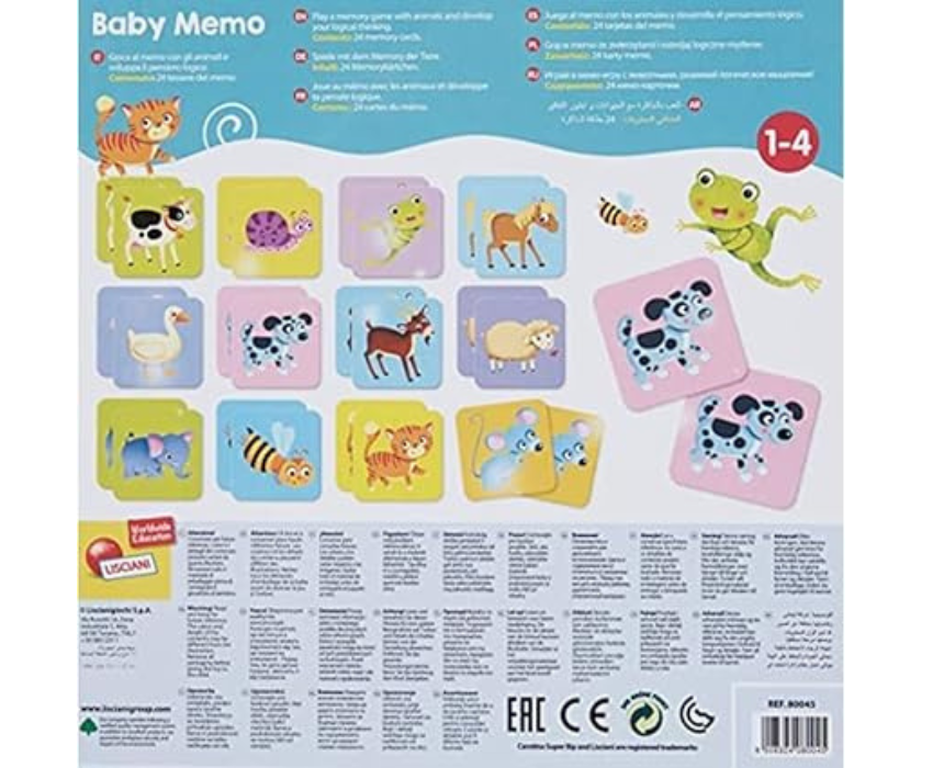 The memory game is designed to help young children develop concentration and matching skills through fun animal themed gameplay that encourages early learning. It supports cognitive development and visual recognition while keeping kids engaged in interactive play. Ideal for playtime at home or group activities, it can be used on a table or play mat for enjoyable learning sessions.
