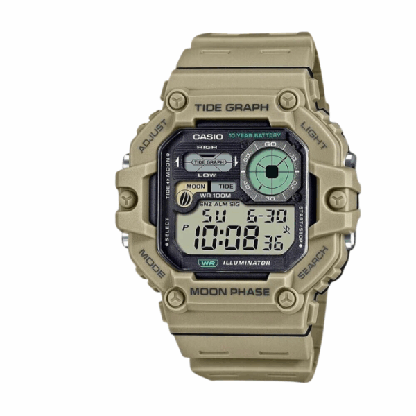 The Casio Glu Watch AE 1200WHB 3BVDF features a digital display with a green case, black panel cover, and durable green cloth strap for a sporty, comfortable fit. Its rugged design pairs well with casual outfits, outdoor wear, or street-inspired looks, making it a versatile choice for everyday adventures. A reliable digital watch combining classic Casio functionality with practical style.