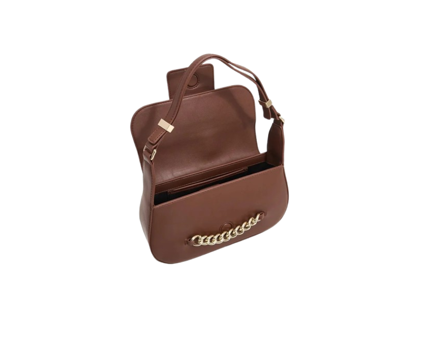 This structured women bag features a smooth taupe finish with a flap closure and elegant gold tone hardware for a refined and timeless look. Designed with a comfortable shoulder strap, it offers practicality while maintaining a sophisticated silhouette. Style it with neutral or classic outfits to add a polished and versatile touch.