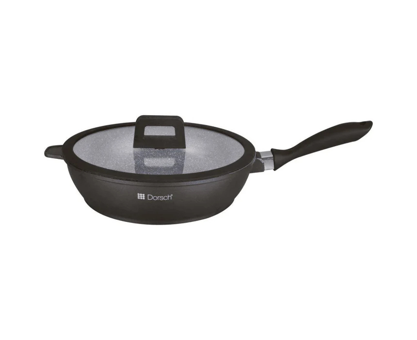 The Dorsch Contemporary Nonstick Deep Sauté Pan is a 28 cm aluminum pan with a stainless steel lid, designed for versatile cooking on gas, electric, glass-ceramic, and induction stoves. With a 3.3L capacity, die-cast construction, and heat resistance up to 230°C, it delivers even cooking and durability. Easy to handle and clean by hand, it includes a lid, handle, and knob, making it ideal for sautéing, frying, and everyday meals.
