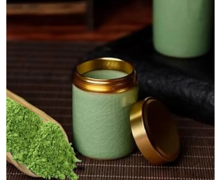 Keep your matcha fresh and stylish with this 100ml ceramic storage jar, featuring a leaf-textured design and a golden airtight lid. Perfect for storing ceremonial-grade matcha, it protects powder from light and moisture while adding elegance to your countertop or tea shelf. Ideal for matcha lovers, gifting, or displaying your tea collection with flair.