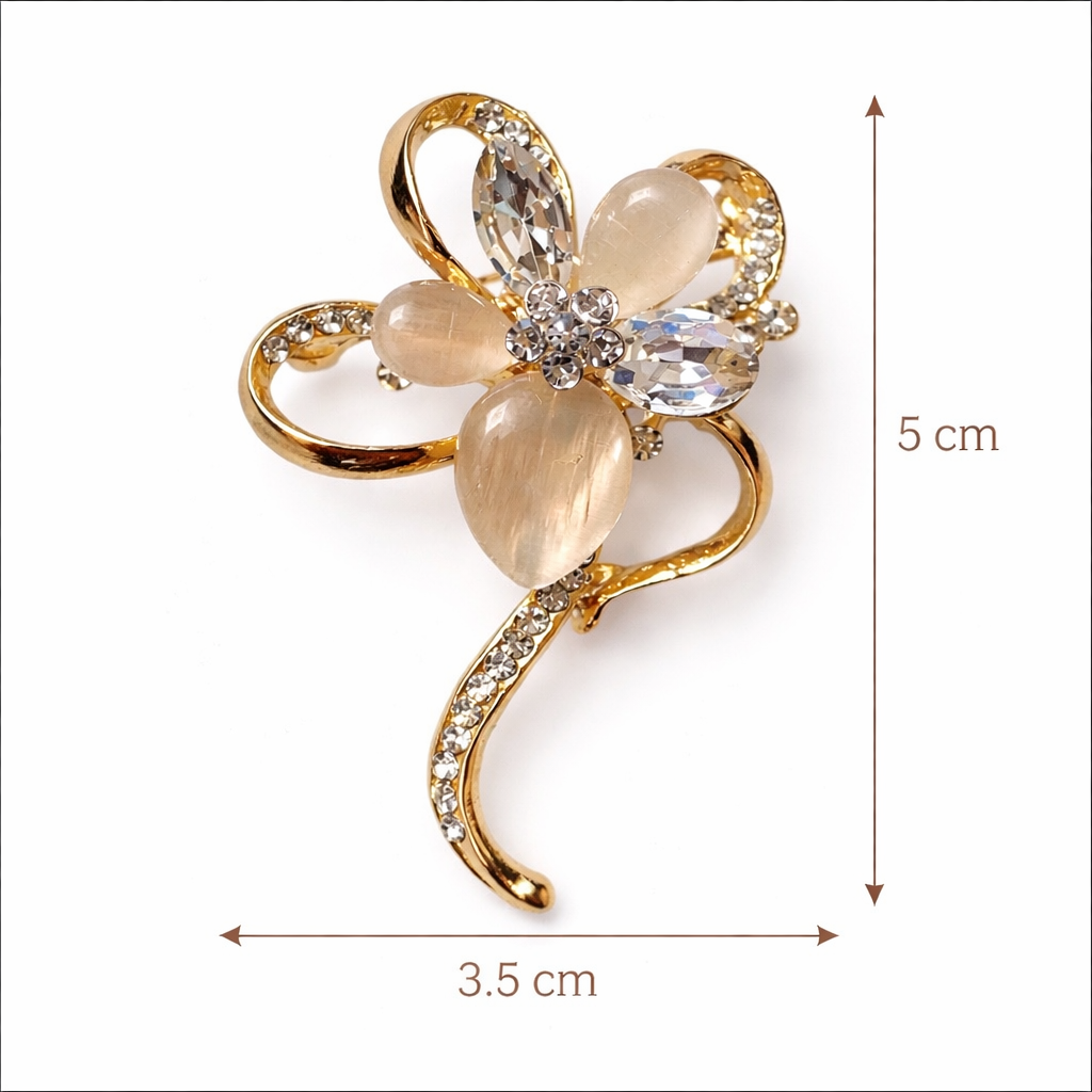 A refined brooch designed to add softness, elegance, and shine to your outfit. This floral brooch features champagne-toned petals, sparkling crystal accents, and a polished gold-tone finish for a graceful statement look.