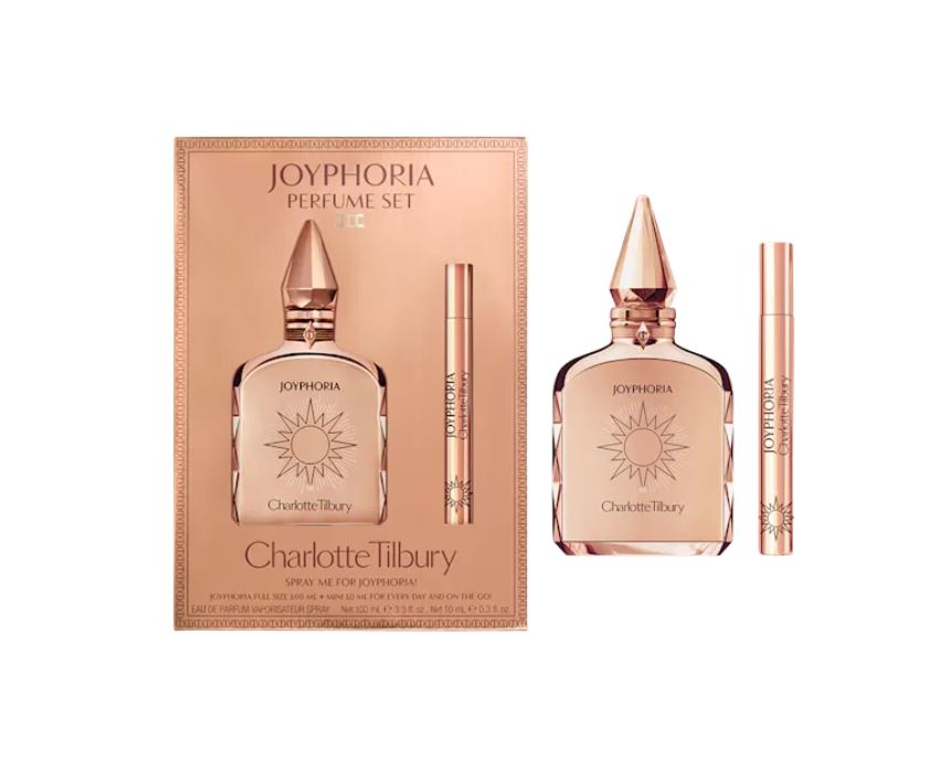 Charlotte Tilbury Joyphoria Perfume Gift Set includes 100ml and 10ml bottles of the euphoric Joyphoria fragrance, a radiant, summery scent that evokes pure paradise. Blending Joyful Petitgrain Oil, Euphoric Coconut Water Accord, Uplifting Neroli, Tuberose Absolute, Jasmine Sambac, Ylang Ylang, Vanilla Bean Extract, and Cashmere Wood, it creates a warm, luminous, and joyful aroma. Perfect for gifting or everyday indulgence, spray on pulse points for an uplifting, long-lasting fragrance experience.