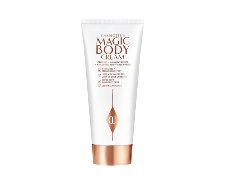 Charlotte Tilbury Magic Body Cream 200ml is a nourishing body cream that melts into the skin to hydrate, smooth, and revive with a radiant, non-sticky glow. Infused with hyaluronic acid, vitamin C, and caffeine, it helps reduce the appearance of cellulite and stretch marks while leaving skin soft, supple, and lightly scented with sweet florals and green mint. Ideal for daily use to achieve hydrated, glowing, and smooth skin.