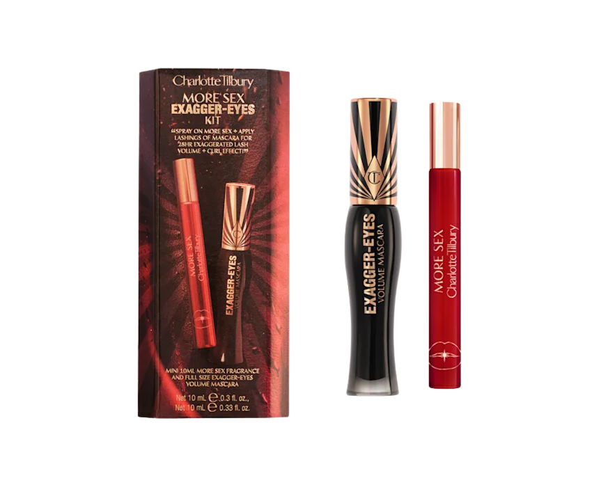 Charlotte Tilbury More Sex Exagger-Eyes Kit combines a 10ml bottle of the globally-loved More Sex fragrance with a 10ml Exagger-Eyes Volume Mascara for an irresistible, seductive look. The mascara delivers 28-hour exaggerated volume and curl with Lash Vinyl-Black Wrap Tech and an Ultra-Curved Lash Styler Brush, while the fragrance blends Seductive Sexual Accord, Velvety Musk, Addictive Leather Accord, and Sensual Sandalwood Oil for a captivating aura. Perfect for party season, this kit creates bigger, brighter eyes and an alluring scent.