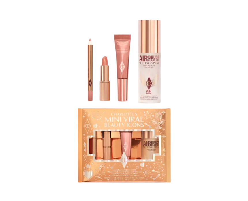 Charlotte Tilbury Charlotte’s Mini Viral Beauty Icons Travel Size Makeup Kit is a must-have set featuring four bestselling icons for glowing, long-lasting makeup on the go. The kit includes the Pinkgasm Beauty Light Wand, AIRbrush Flawless Setting Spray, Pillow Talk Matte Revolution Lipstick, and Pillow Talk Lip Cheat to create a radiant complexion and defined, flattering lips. Apply the highlighter for glow, set makeup for all-day wear, and finish with Pillow Talk lips for an iconic, gift-ready look.