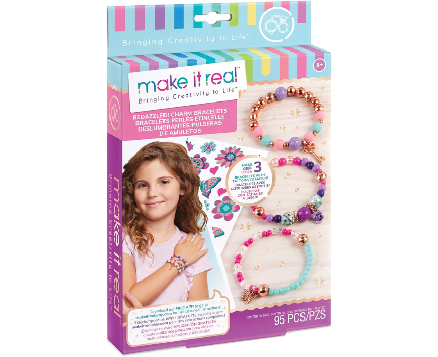 The Make It Real Bedazzled! Charm Bracelets Kit lets kids create up to three unique butterfly-themed bracelets using gold charms, beads, and matching temporary tattoo stickers. This all-in-one DIY jewelry set helps develop fine-motor, visual, and cognitive skills while encouraging creativity and self-expression. Designed for ages 8 and up, it includes a play tray and all materials needed for hours of fashionable, hands-on fun.