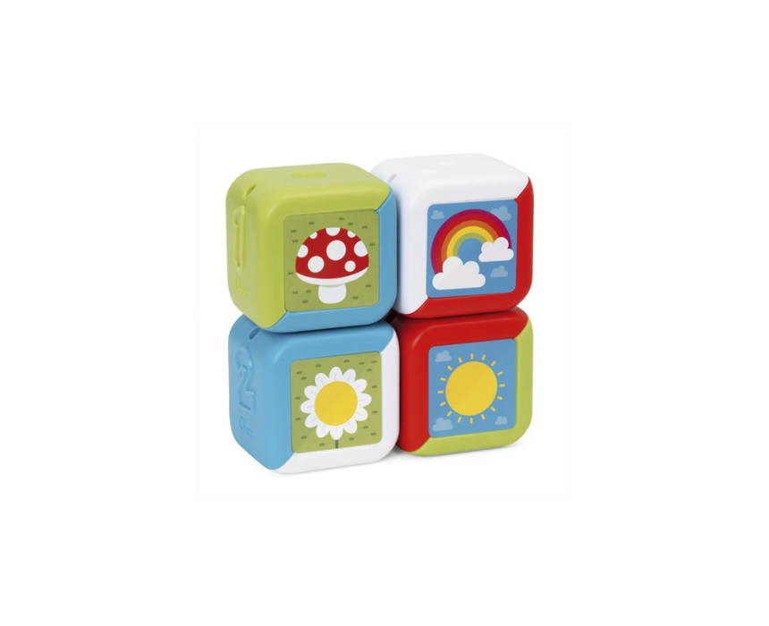This evolutive cube toy set includes four colourful activity cubes designed to stimulate manual, logical, and cognitive skills from 10 to 36 months, developed in collaboration with ANPE. Younger children can stack and explore the four manual activities, while older toddlers learn picture association and numerical order to build correctly. Ideal to place on the floor or play mat, it encourages hands-on learning during independent or guided play.