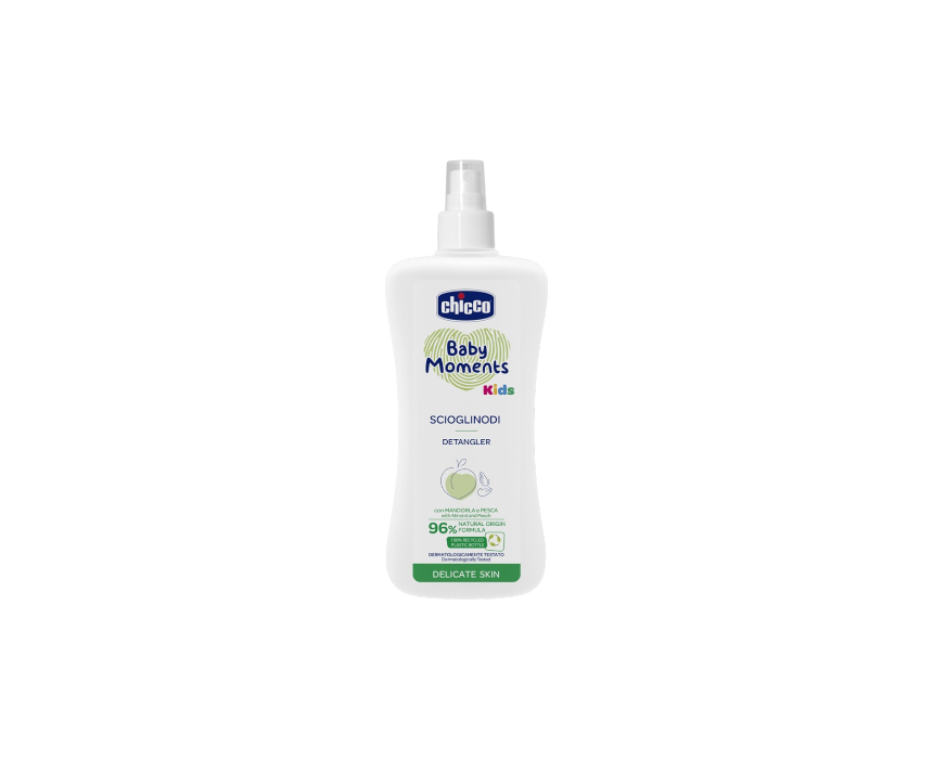 Chicco Detangler Spray is formulated with 96% natural-origin ingredients to gently detangle baby and children’s hair. Enriched with nourishing almond extract and refreshing peach extract, it leaves hair soft, smooth, and easy to comb. Dermatologically and ophthalmologically tested for safe daily use.