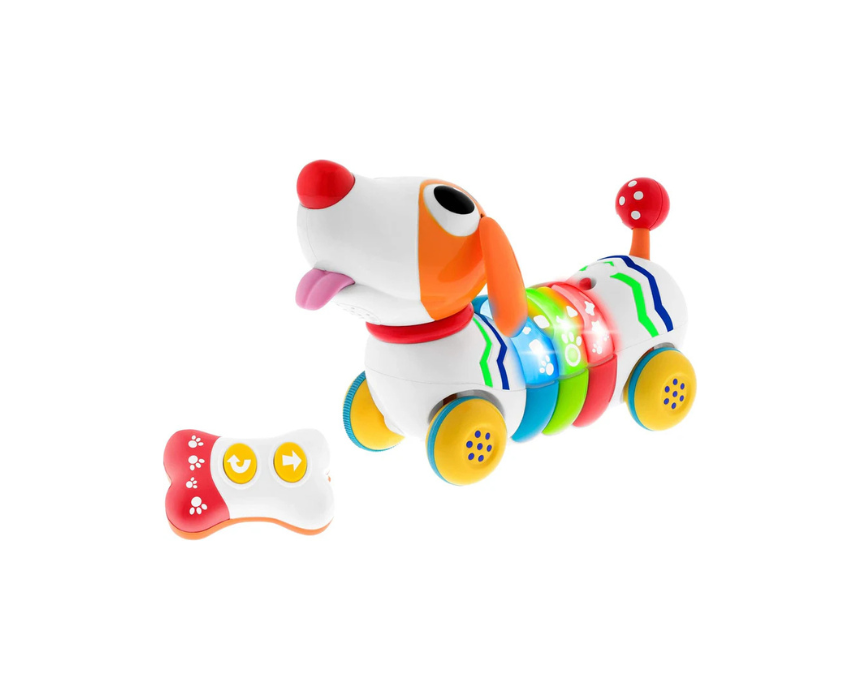 Chicco DogRemi is a remote controlled electronic dog that moves forward and backward with an infrared controller, barking, wagging its tail, shaking its head, and making playful sounds. Featuring a kids keyboard with five coloured keys, lights, sound effects, and two interactive modes for music or real dog sounds, it encourages creative and imaginative play. Place it on the floor and guide it with the remote for engaging, hands on fun.
