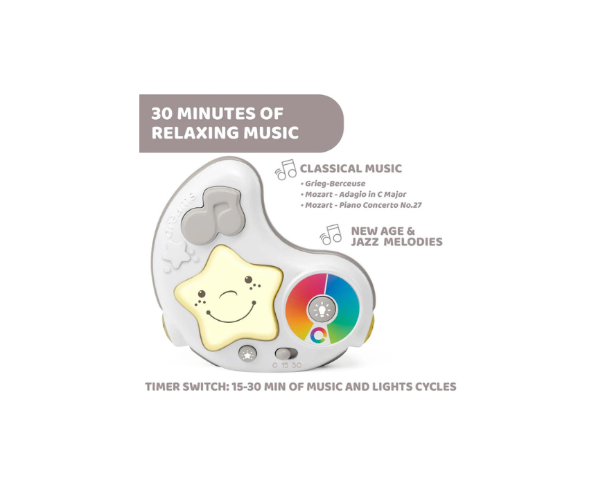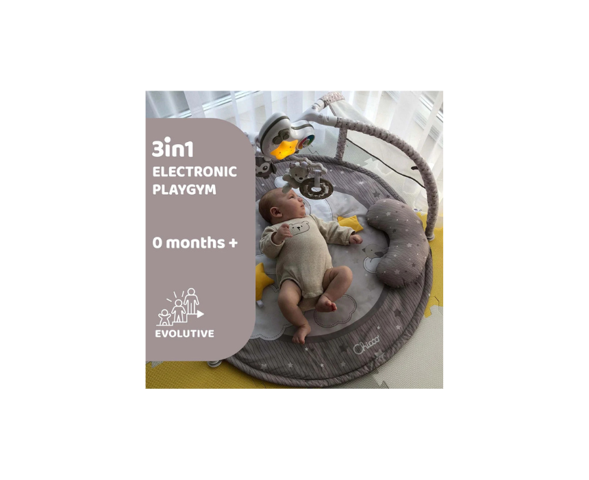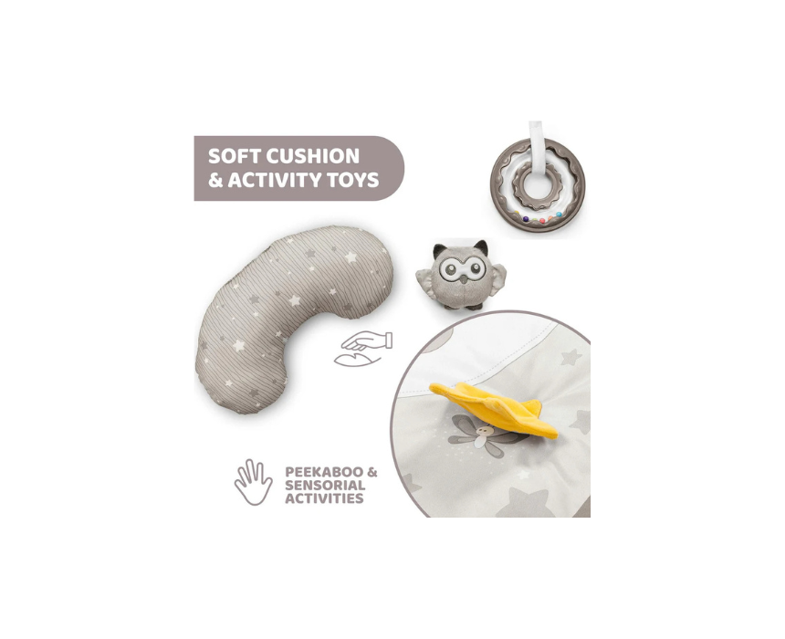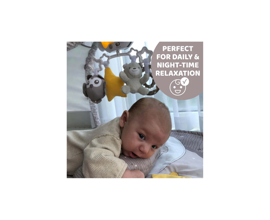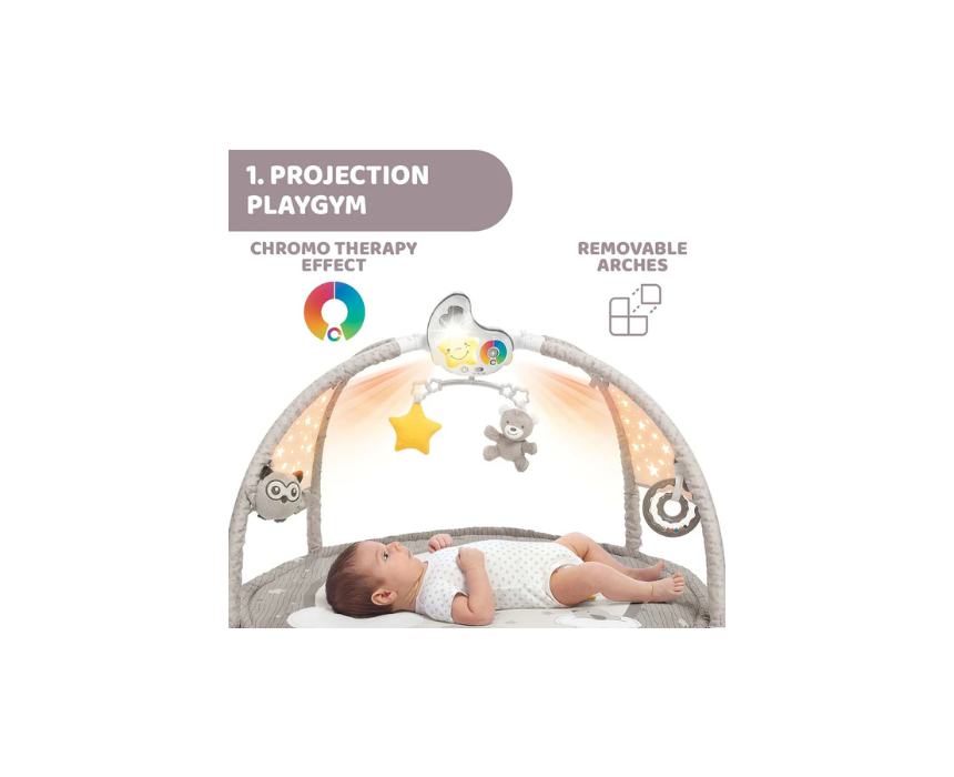 The Chicco Day and Night Baby Play Mat with Pillow offers three configurations to grow with your child, combining playtime and relaxation with music and light. Featuring an electronic play arch and a removable moon shaped night light that projects colour changing stars and plays melodies with 15 or 30 minute timers, it supports both daytime activity and bedtime comfort. Use it flat for play, with the arch for stimulation, or place the night light on a bedside table for soothing sleep.