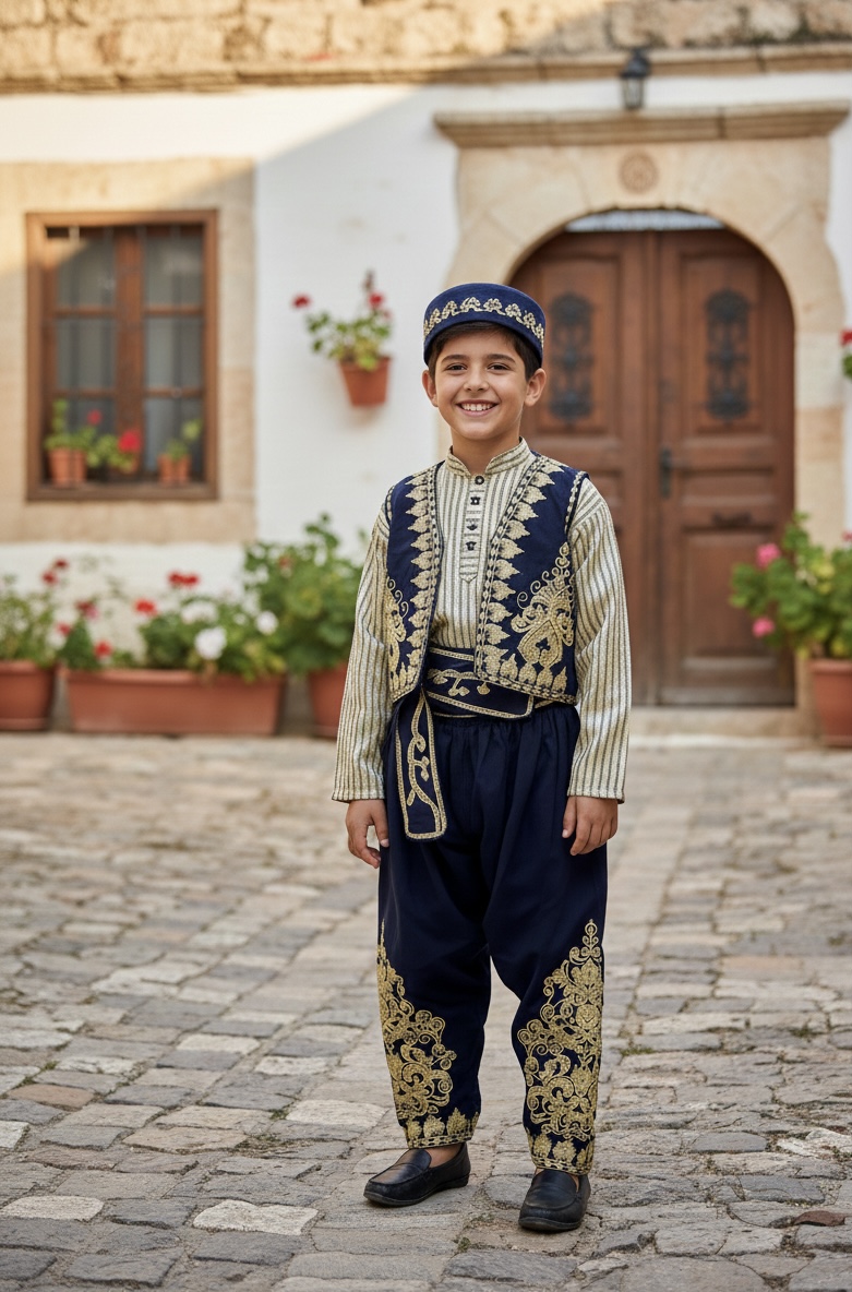 Stunning black shirwal with shimmering gold embroidery, for children. An excellent piece for Halloween, Independence Day, Berbara, or other Lebanese traditional events. Available in sizes 1-6.