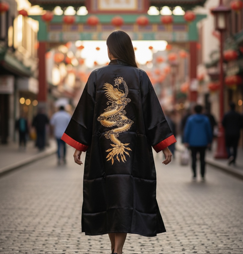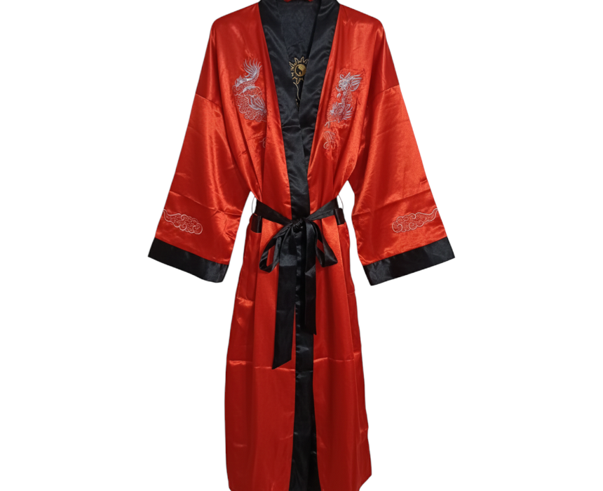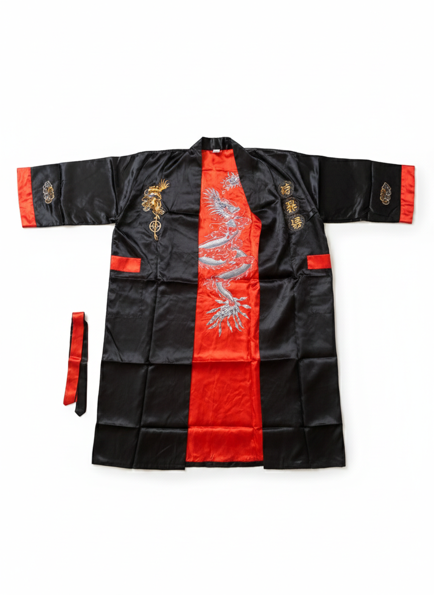 This luxurious double faced kimono robe offers two striking looks in one, from a luxurious satin fabric. One side is deep red, with the reverse side showcasing a deep black finish. Both sides have traditional Chinese motifs, such as the dragon.