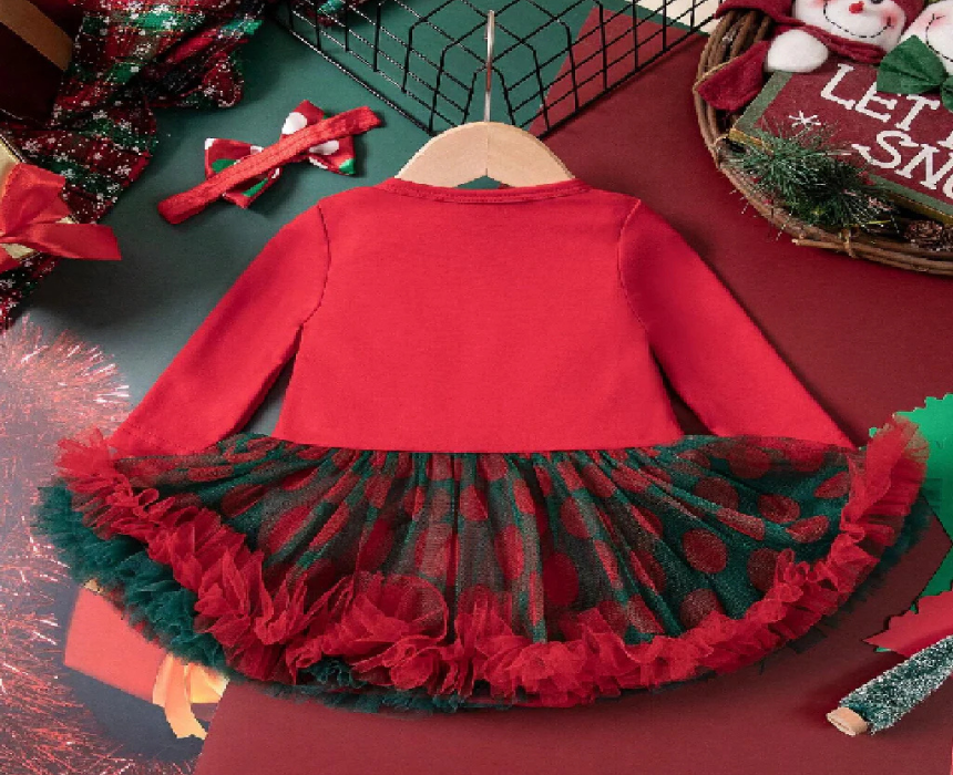 My 1st Christmas Baby Dress 3–6M features a soft red cotton bodysuit with a festive Christmas tree print and a layered tulle skirt in red and green polka dots. Designed for 3–6 months or 62–68 cm, this adorable dress is perfect for capturing holiday memories, Christmas photos, and family gatherings, styled beautifully with tights or soft baby shoes.