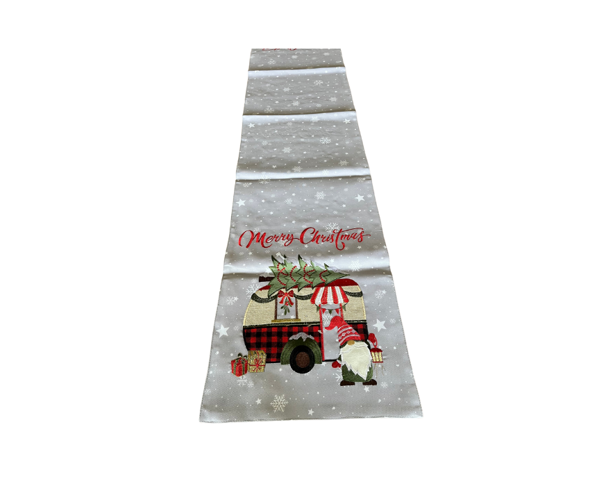The Christmas Car Table Runner adds festive charm to any holiday setting with its grey printed fabric and detailed 3D Christmas car, tree, and gnome in red, green, beige, and black fabrics. Finished with Merry Christmas embroidery in bright red, this 37x175cm runner brings warmth and elegance to dining or accent tables. Style it as a centerpiece for seasonal meals or to enhance everyday holiday decor.