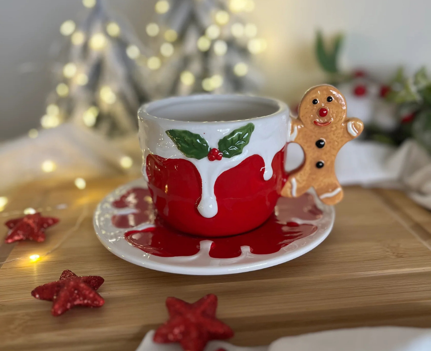 The Christmas Gingerbread Mug features an adorable 3D gingerbread design with a matching saucer, making it perfect for enjoying hot cocoa, coffee, or other festive beverages. Ideal as a gift or for adding holiday cheer to your morning routine, it pairs beautifully with other seasonal décor for a cozy, festive table setting.