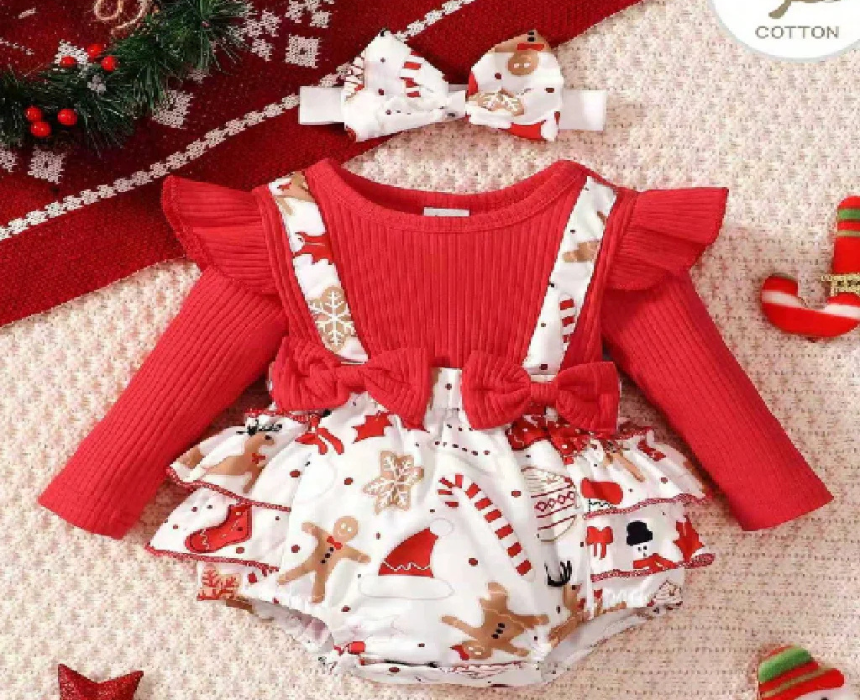 Christmas Outfit with Red Top & Headband 6–9M 3 pcs includes a soft red ribbed long-sleeve top, a festive suspender-style romper printed with gingerbread, candy canes, and reindeer, and a matching headband. Designed for 6–9 months or 68–74 cm, this adorable 3-piece set is perfect for Christmas parties, family photos, and cozy winter days, styled easily with tights or soft baby shoes.