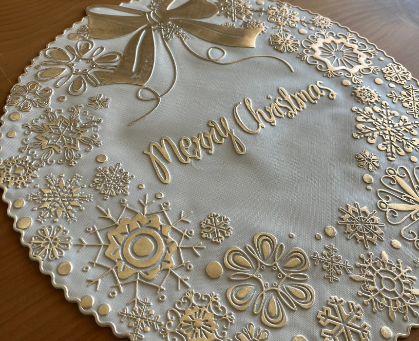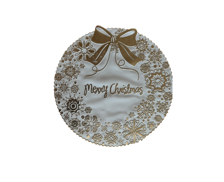 The Christmas Placemats Set of 6 elevates any holiday table with round PVC waterproof mats in elegant beige and champagne tones. Featuring a festive bow and Merry Christmas text, they add a luxurious touch to dining setups and are perfect for styling under plates, centerpieces, or holiday table décor.