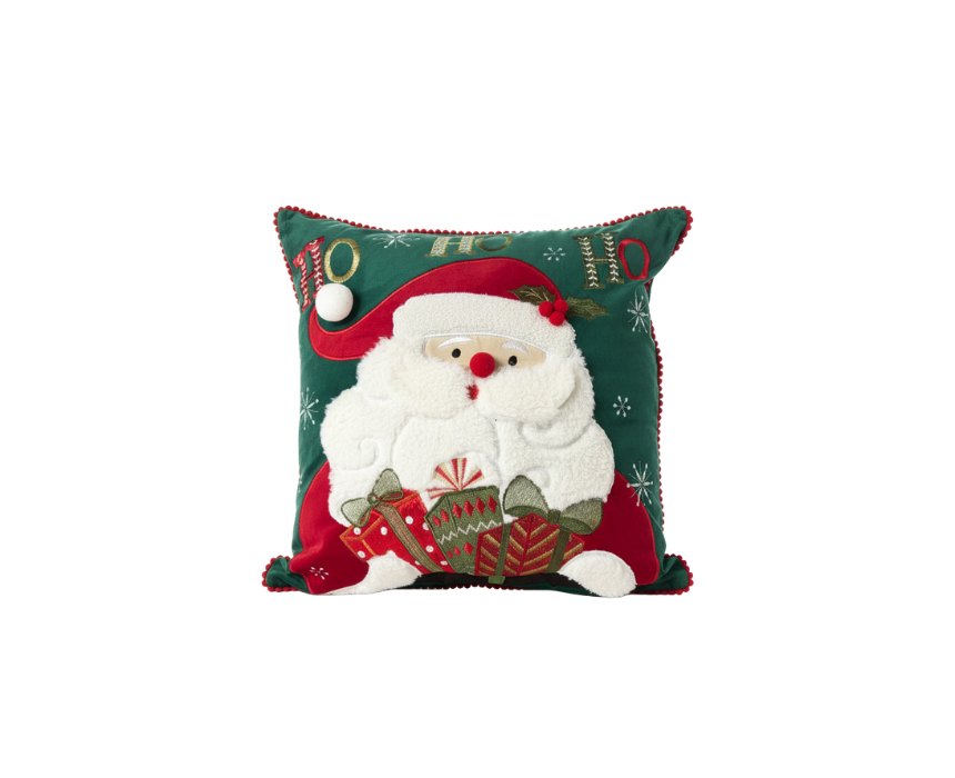 The Christmas Santa Cushion Cover 45x45cm features soft green velvet with an embroidered Santa, 3D details, and a fluffy fur beard, finished with charming pompom borders. It adds a festive accent to sofas, beds, or armchairs and pairs perfectly with matching holiday cushions or optional cushion filling for a cozy seasonal setup.