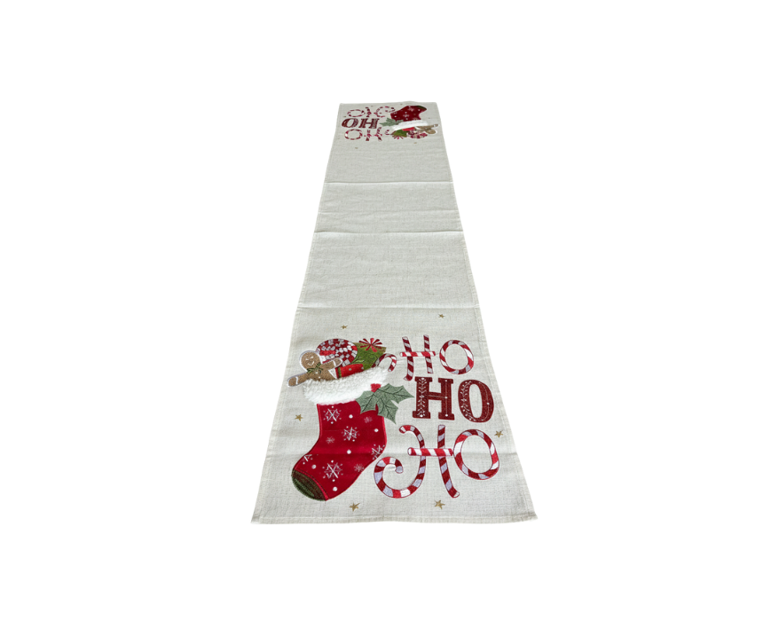 This 35x175cm Christmas Socks Table Runner brings festive charm to any dining table with 3D red velvet and wool socks, gingerbread jute details, embroidered candies and gifts, “Ho ho ho” embroidery, and gold stars. Its beige fabric base complements holiday décor and can be styled with matching tableware, candles, or seasonal centerpieces for a warm and inviting look.