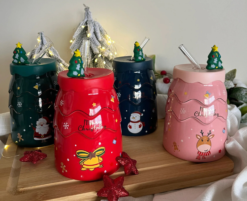 This Christmas straw mug features a glass straw and a silicone cover with a festive 3D design, available in four cheerful holiday colors. Perfect for work, travel, or cozy days at home, it adds a fun and practical twist to enjoying coffee or cold drinks throughout the season.