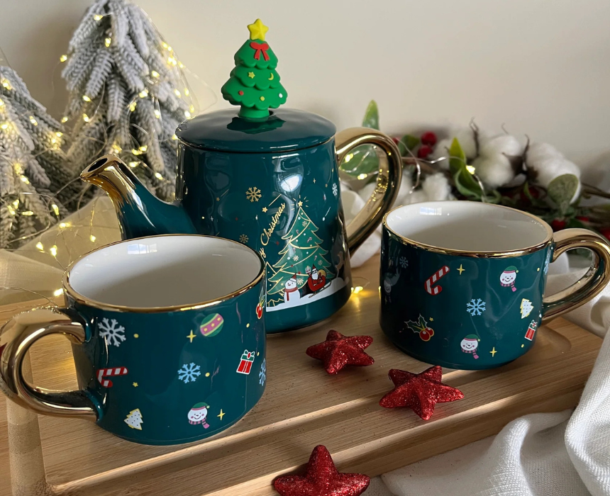This Christmas tea set features a green teapot with two small matching mugs, creating a cozy and festive addition to any holiday gathering or gift. Its classic design and warm seasonal colors make it perfect for serving holiday drinks on winter evenings or displaying as part of a Christmas-themed table setup.