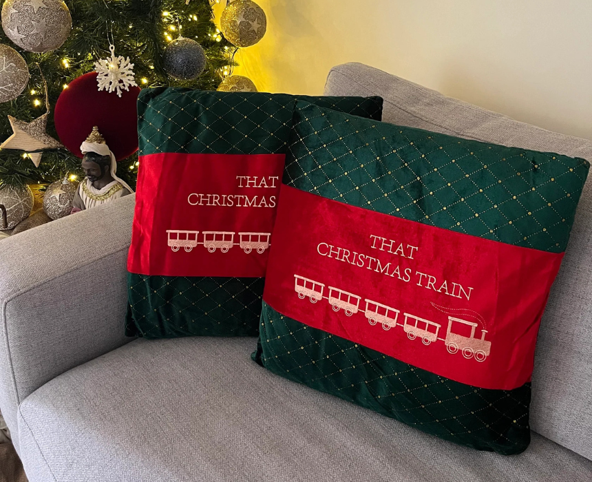 Complete your holiday décor with the Christmas Train Cushion, crafted from soft red and green velvet for a luxurious feel. Featuring a golden train design, it adds festive charm to sofas, chairs, or beds and pairs perfectly with matching holiday accessories. The included filling ensures comfort and support, making it both stylish and functional for seasonal gatherings.