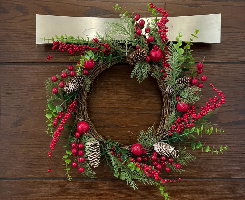 The Christmas Wreath 45cmx10cm features lush greenery, vibrant red cherries, and classic pine accents, crafted from high-quality materials for lasting holiday charm. It can be styled on doors, walls, or mantels to instantly enhance festive décor and bring seasonal cheer to any home.