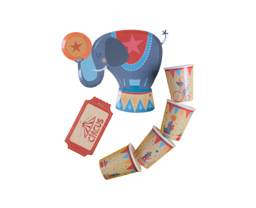 The Circus Paper Tableware Set contains 8 plates 8 cups and 20 napkins featuring colorful circus themed designs. Made from eco friendly paper it is perfect for kids parties and themed events making cleanup easy. Add a fun and playful touch to any table setup with this vibrant disposable set.