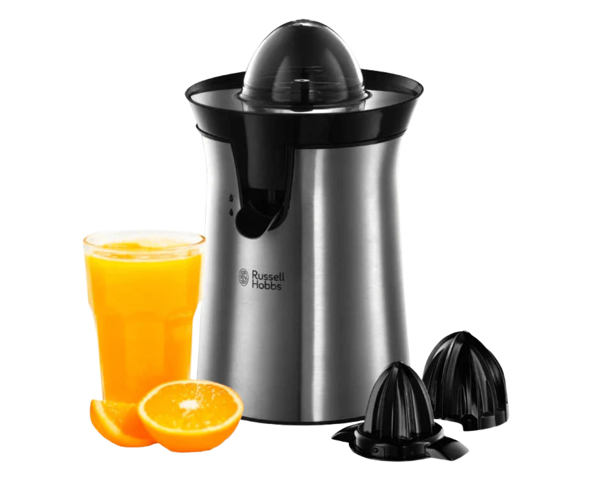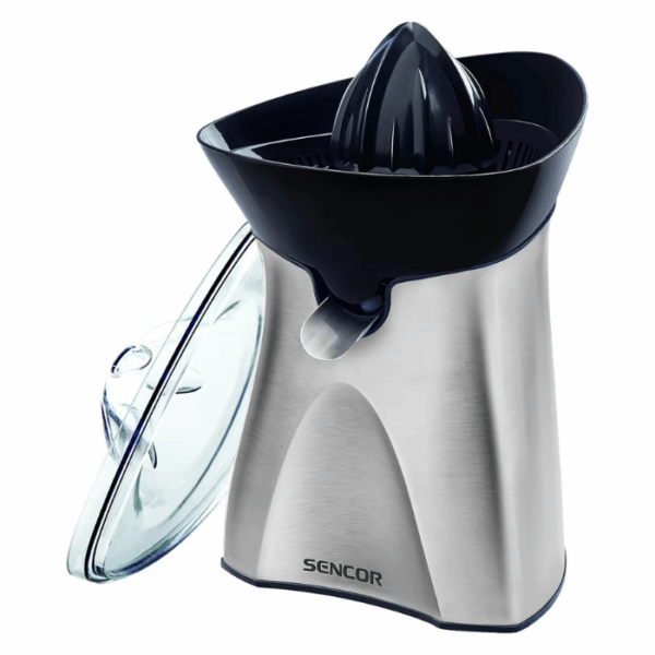 This stylish citrus juicer features two interchangeable cones with automatic rotation and an auto-reversing action for effortless juice extraction. Its brushed stainless steel housing with black accents combines durability and modern design, while the 60W motor ensures efficient performance. Compact cord storage makes it convenient to keep your countertop tidy and organized.