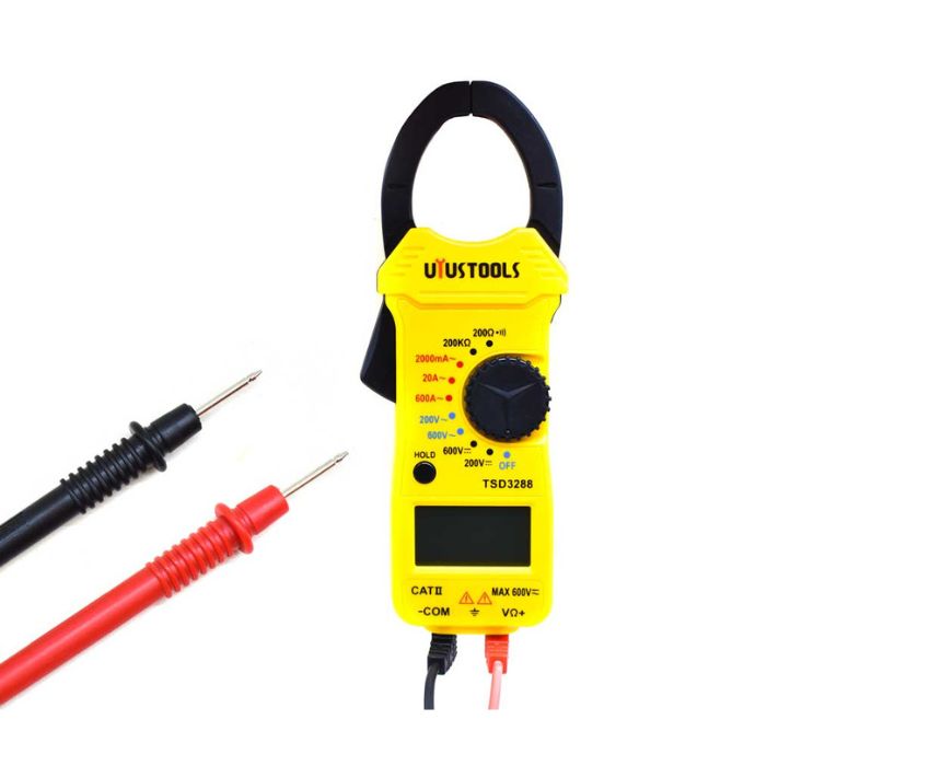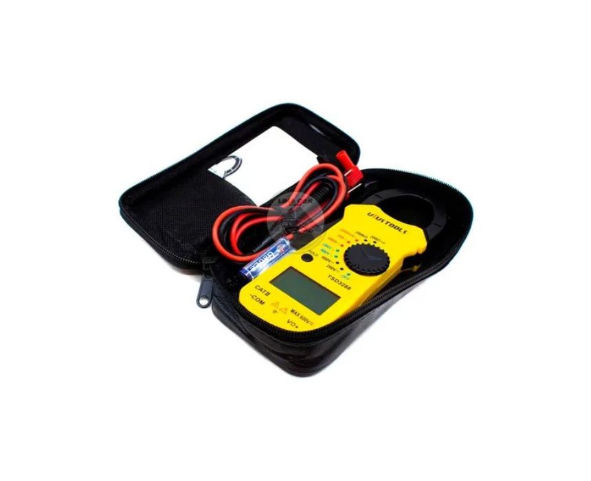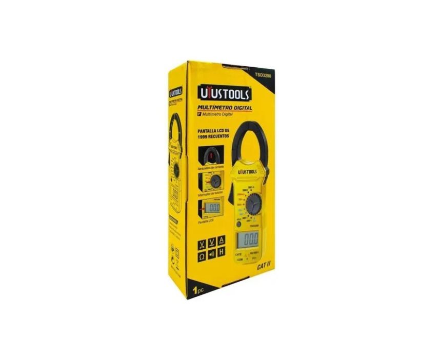 The TSD3288 Clamp Meter is a lightweight 240g digital multimeter made of durable yellow plastic, measuring 19.5cm x 7cm x 2.5cm. It accurately measures AC/DC voltage, AC current, resistance, continuity, diode, and temperature with a 3 1/2 digit 2000 count display. Featuring polarity indication, data and max hold, overload protection, auto shutdown, and a 41×21.5mm LED display, it includes two test cables and two AAA batteries for reliable use.