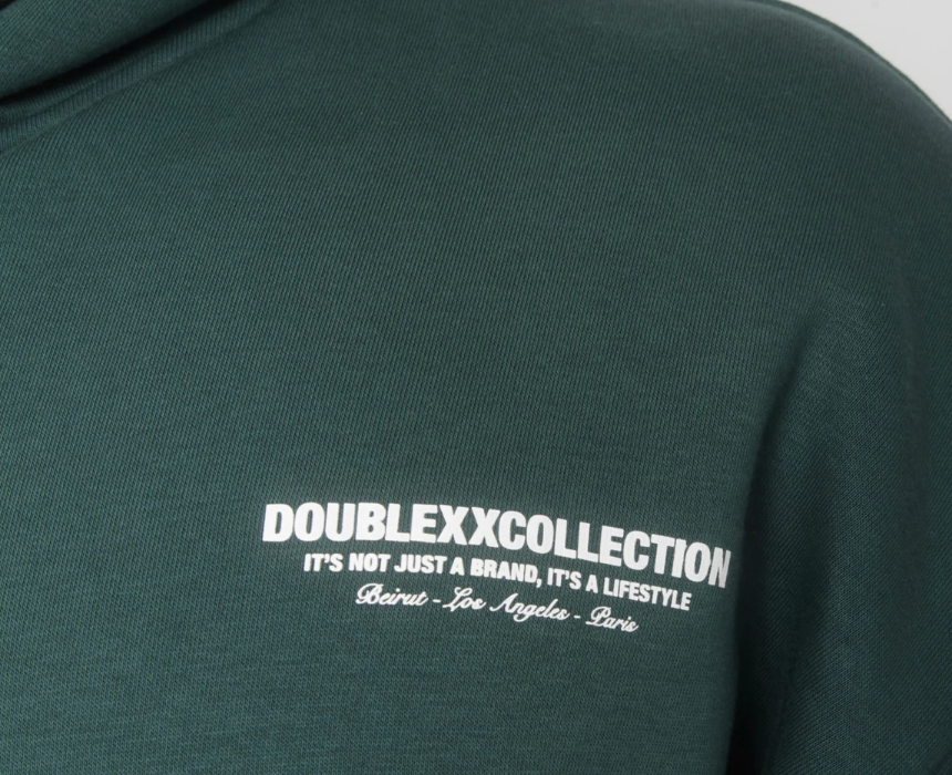 This Classic Hoodie in dark teal green is a premium oversized hoodie for men and women from DOUBLEXXCOLLECTION, combining timeless style with ultimate comfort. It features a high-density print on the front left chest with “doublexxcollection,” the slogan “It’s not just a brand, it’s a lifestyle,” and “Beirut-Los Angeles-Paris,” while the back showcases the same intricate design for a bold streetwear statement. Crafted from premium 3-fleece fabric, it offers a soft, luxurious feel perfect for casual or urban-inspired looks.